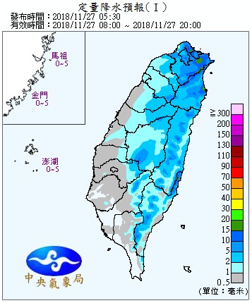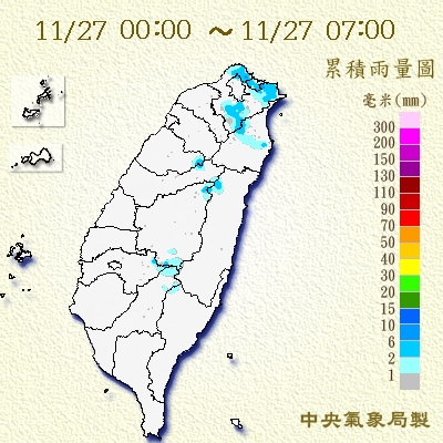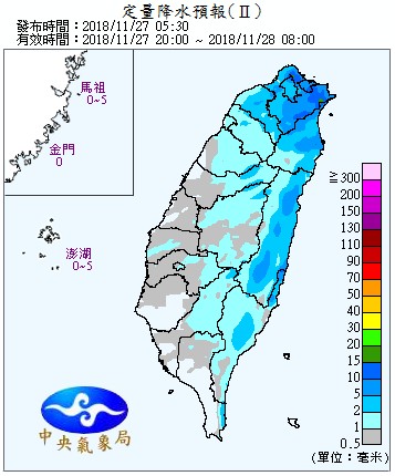 今(27日)晨最低溫落在淡水的19.2度,北部及宜花一整天偏涼,白天高溫23、24度,中南部及東南部高溫26至28度,各地早晚偏涼,入夜後低溫約19度至21度,日夜溫差大。因東北季風及南方雲系北移影響,各地仍有局部短暫雨,整體來看,白天降雨稍趨緩,晚上降雨機率較高,不過白天基隆北海岸、大臺北山區及宜蘭斷斷續續有飄雨的情形,提醒民眾要記得攜帶雨具。
