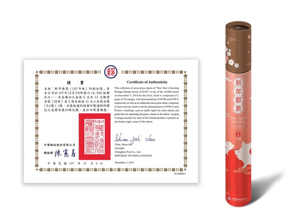另外,為增添集郵樂趣,中華郵政製作「新年郵票印刷全張」郵品,在郵票發行當天供售,售價1400元,郵品內含未裁切的面值6元及13元郵票全張(20枚)各2張、小全張印刷全張(含9張小全張)1張及證書1份,全張紙邊保留印製過程所標記色標、裁切線等記號,並用專用典藏圓筒收納。