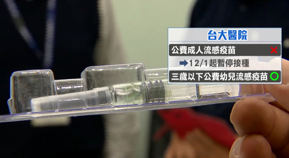 全台流感疫苗大缺貨,就連龍頭台大醫院都搶不到,官網公告公費成人疫苗,12月1號開始暫停接種,剩3歲以下的幼兒流感疫苗可以施打,馬偕醫院更在11月28號在官網公告,成人疫苗庫存不足,暫停施打,國泰醫院不只公費疫苗庫存不足,自費疫苗因為廠商公費不足,直到12月底都沒得打,榮總醫院不夠,三軍總醫院公告,從12月3號開始就會暫停施打,新光的流感疫苗也所剩不多。
