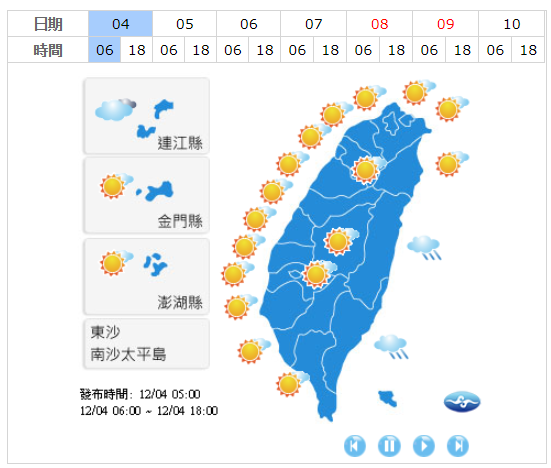 中央氣象局表示,今白天臺灣各地及澎湖、金門、馬祖大多為晴到多雲的天氣,到了傍晚,受到微弱鋒面影響,東半部地區有局部短暫雨,北部地區及馬祖也將轉為有局部短暫雨的天氣,其他地區及澎湖、金門則是多雲到晴的天氣。溫度方面,入夜後各地低溫16至18℃、高溫28至30℃。氣象局也提醒,清晨中南部地區及馬祖亦有局部霧或低雲影響能見度,須多加注意安全。