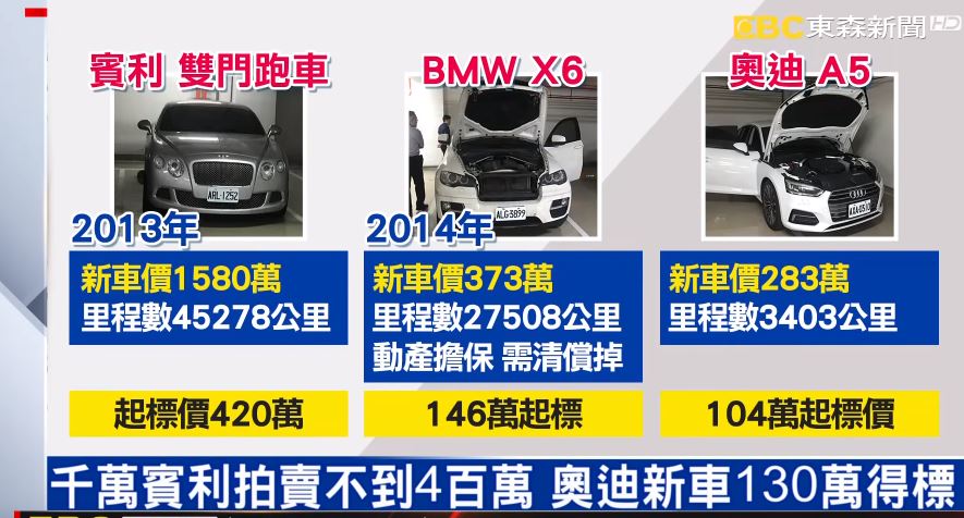 這回拍賣的三款車有2014年車款的賓利雙門跑車,新車價1萬5百多萬,里程數4萬多;而去年車款的奧迪A5,里程數才2千多,也難怪如此搶手;另外一台則是BMW X6,車況也不錯,但相較之下,因為車子還有擔保價沒付完,也難怪拍賣時,沒什麼有興趣。