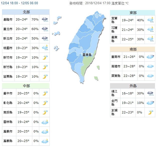今天白天各地晴朗穩定,中午西半部高溫達30至32度,東半部也有28、29度,不過,朱美霖說,隨著鋒面在今天深夜通過台灣北部海面及東北風增強,迎風面水氣將增多,桃園以北及東北部地區降雨機率提高,花東也有局部短暫雨。