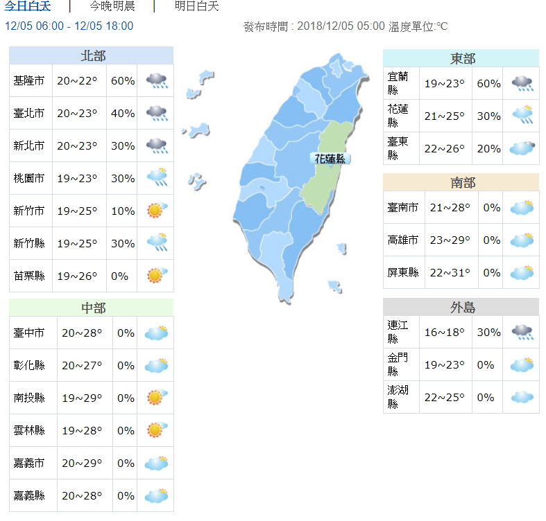 氣象局指出,今白天受東北風影響,北部及東半部地區有局部短暫雨的可能,其中桃園以北及東北部大部分時間雲量稍多,偶爾有小飄雨,靠近基隆北海岸、宜蘭地區降雨機率更大,中南部地區則不太受影響,仍維持晴到多雲的天氣。桃園以北及東北部白天高溫只有22、23度,竹苗及花東則約24至26度,相較昨天下降許多,中南部仍有28至30度,感受溫暖舒適;深夜以後各地低溫約19至21度;北台灣整天偏涼,中南部則是日夜溫差大,請大家留意溫度變化適時調整穿著。