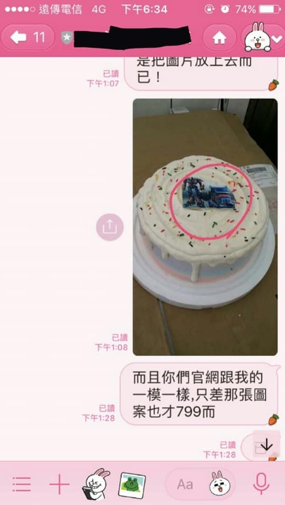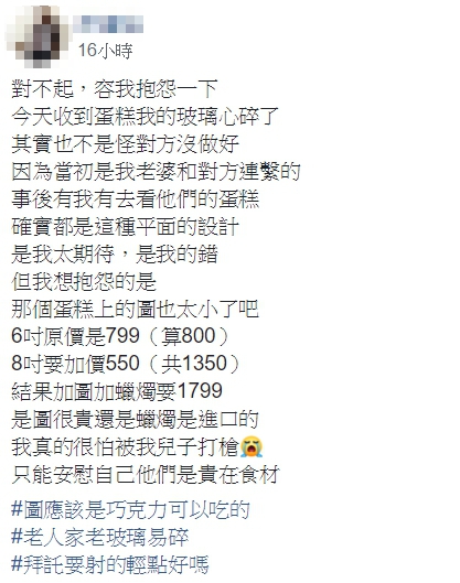 「收到蛋糕,我的玻璃心碎了!」只見原PO指定的變形金剛圖案,僅占了整個蛋糕的5分之1,且和他當初想像的「手繪」相差甚遠,僅是一張照片放在普通蛋糕中間,雖然原PO坦言「當初是我老婆和對方連繫的,事後有我有去看他們的蛋糕,確實都是這種平面的設計,是我太期待,是我的錯」,但還是非常不解,蛋糕原價只要1349,加上印有圖案的巧克力和蠟燭後,竟然要多收450元,事後原PO向店家反映,店家還強調圖片「幾乎一樣」,讓他忍不住哀號「是圖很貴還是蠟燭是進口的?我真的很怕被我兒子打槍,只能安慰自己他們是貴在食材…」。