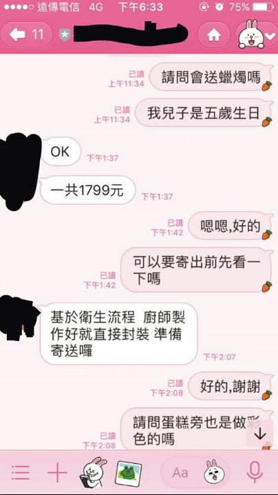 原PO在臉書《爆怨公社》表示,和老婆討論過後,決定訂製一個變形金剛圖案的蛋糕送給兒子,隨即上網搜尋想要的圖案,傳送給蛋糕店家做參考,同時詢問「請問會送蠟燭嗎?我兒子是5歲生日」,店家表示沒問題,並報價1799元。原PO曾主動詢問,是否能在蛋糕寄出前看一下成品,不過店家基於衛生流程問題而婉拒,讓原PO不疑有他,滿心期待。