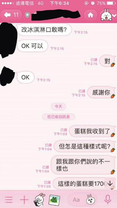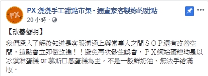 對此,店家澄清一直以來都沒有說是「手繪」蛋糕,僅以消費者提供圖片印製、與插畫家合作繪畫Q圖後印製以及網站上插畫家的正版授權圖案三種方式,可能是消費者自己誤會,才導致收到貨品不滿意,而插在蛋糕上的立牌可能是宅配運送過程中倒下,他們表示常收到消費者回傳來的商品圖回饋,不可能會有欺騙行為。