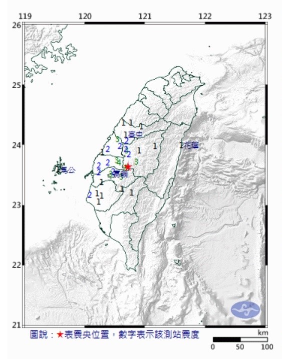 其他各地最大震度:南投縣信義鄉3級、名間3級;雲林縣草嶺3級、斗六市3級;嘉義縣番路3級;嘉義市3級;彰化縣彰化市3級。