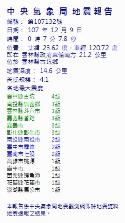 根據中央氣象局地震報告,今天凌晨0時7分7.8秒雲林縣發生芮氏規模4.1地震,震央位於雲林縣政府東偏南方21.2公里的古坑鄉,震源深度14.6公里,最大震度雲林縣古坑鄉4級。