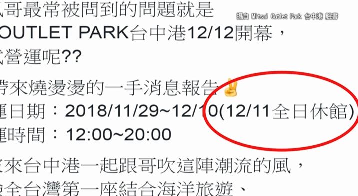 有的民眾遠從基隆開了3個小時車子到台中結果撲空,但其實商場臉書、官網都有公告說明,10日試營運結束,11日休館一天,12日正式開幕,台中三井Outlet是台灣第一座海港購物商城斥資25億打造,佔地5萬4千坪,還有一座高60公尺的大型摩天輪可以觀賞夕陽海景,試營運期間不管假日還是平日,商場總是擠滿人潮大排長龍。