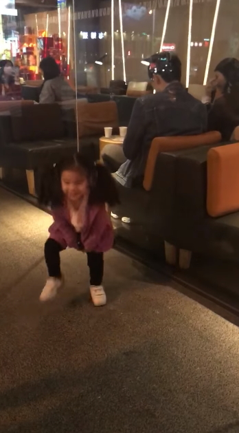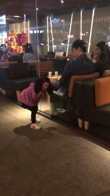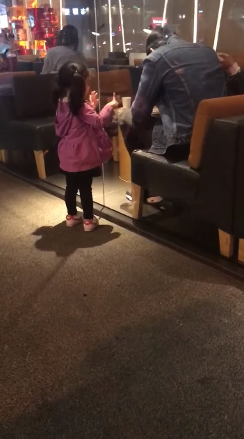 這位媽媽帶著2歲半的女兒「蕎蕎」到台中屋馬燒肉店用餐,蕎蕎看見帥哥後,竟做出可愛舉動。影片中她穿著粉色外套,長髮綁成雙馬尾,看起來十分甜美。只見蕎蕎看著玻璃另一端坐著身穿牛仔外套的年輕帥哥,竟將手指伸出去貼在玻璃上,示意對方和她互動。