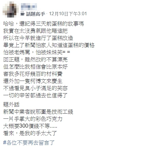 原PO日前在臉書《爆怨公社》透露,兒子生日前,他明明要訂「手繪變形金剛」造型蛋糕,店家送來的卻是在普通蛋糕上,擺放一片印有變形金剛圖案的巧克力,讓他當場傻眼,網友也一面倒喊醜,雖然事後店家澄清是雙方溝通有誤,還發出聲明,強調一片手掌大的彩色巧克力,就要價300元不等,原PO還是難掩失落。