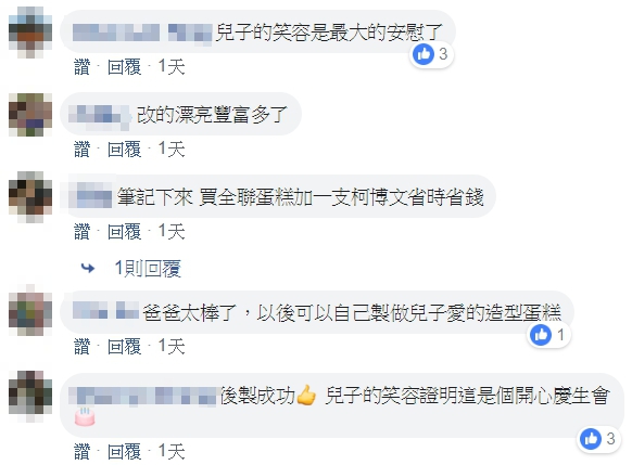 網友看見原PO改造後的成品,紛紛大讚「兒子的笑容是最大的安慰了」、「改的漂亮豐富多了」、「比原本的好太多太多」、「爸爸根本自己做就好了」、「好用心」、「爸爸的愛心蛋糕無價」、「父母的心意最寶貴」、「原本的樣子真是有夠醜」。