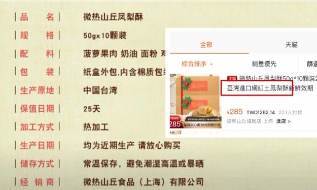 一早就有民眾等在微熱山丘店門口等開店,看來鳳梨酥熱潮還是不減,以酸甜台灣土鳳梨當內餡,打響鳳梨酥名號的微熱山丘,2009年創立後迅擴張,就連東京新加坡香港也在對岸上海設立門市,眼看在上海展店的吳寶春聲明來自中國台灣被罵翻,一樣打出來自台灣,有民眾就在淘寶網發現「微熱山丘」鳳梨酥標題中有「台灣進口土鳳梨酥」字樣,生產原地就寫著中國台灣。
