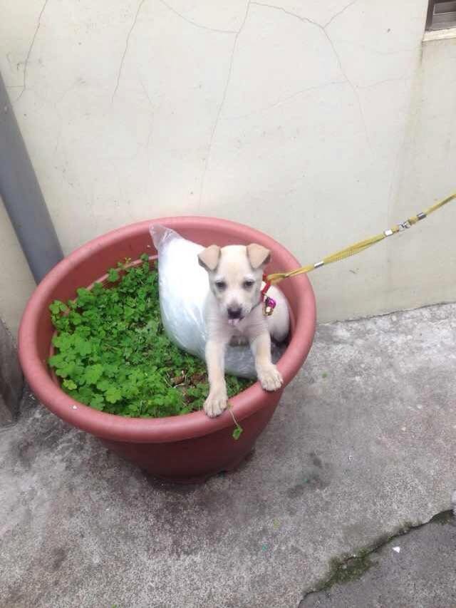 原PO表示,當時米克斯「乖乖」還是幼犬,總是露出無辜表情,超萌模樣讓人瞬間融化,因不放心牠獨自在家,只好也帶去一起上班,加上「乖乖」不會定點便便,又怕牠亂跑失蹤,麻麻只好綁在後方的空地上。