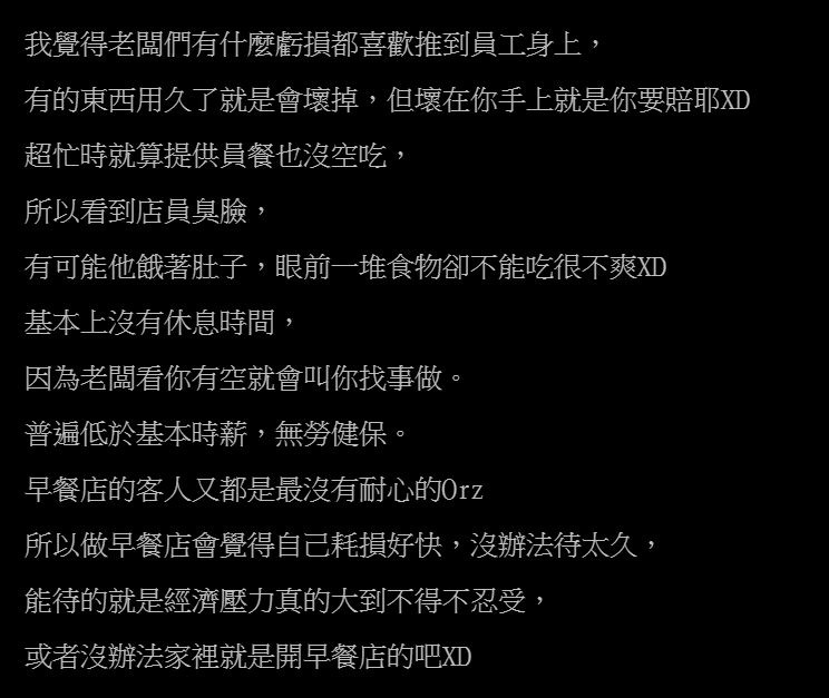 原PO最後有感而發表示,早餐店的老闆喜歡將虧損推到員工身上,要求員工承擔,「東西用久了就是會壞掉,但壞在你手上就是你要賠」,且員工經常忙到沒空吃飯,也沒休息時間,「所以看到店員臭臉,有可能他餓著肚子,眼前一堆食物卻不能吃很不爽」,加上薪水普遍低於基本時薪,又沒有勞健保,因此員工會覺得身心耗損很快,導致待不久,「能待的就是經濟壓力真的大到不得不忍受,或者沒辦法家裡就是開早餐店的吧」。