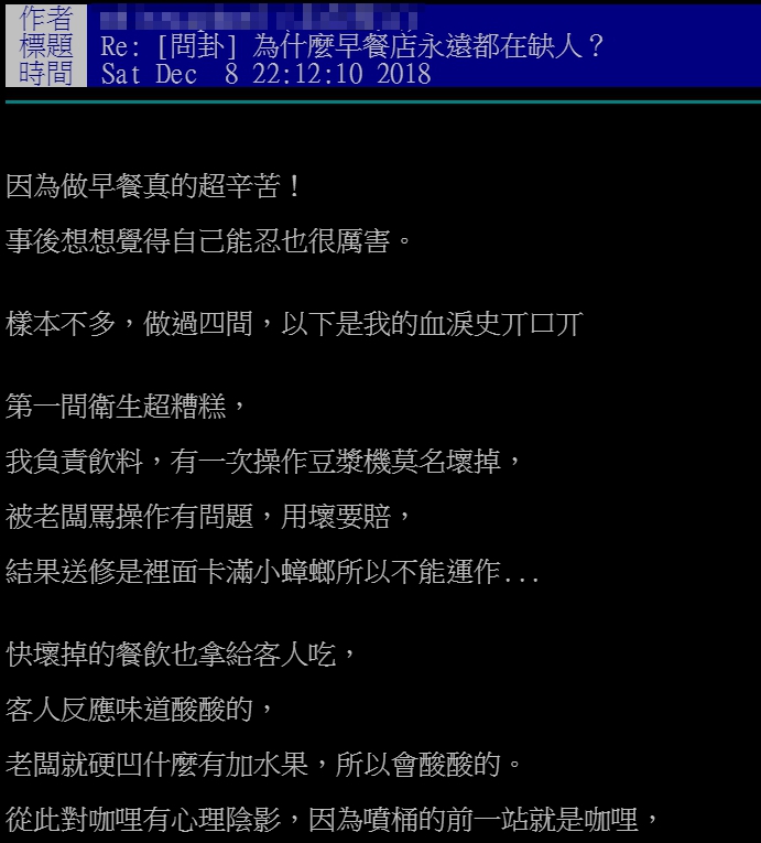 第2家早餐店則是老闆非常小氣,薪水給得斤斤計較,還會拗員工每天「做功德」多上1.5小時的班,遲到5分鐘狠扣時薪100元「但時薪才給85(遠低當時基本時薪)」,還時常會「漏算薪資」,想得到應有的薪水,還必須經過一番鬥智鬥勇,加上該店衛生也欠佳,「醃肉鍋裡有小蟑螂,奶精粉長蛆(知道大冰奶為何通腸了吧),一樣使用」,種種原因讓原PO身心俱疲,做了不到1年就撐不下去。