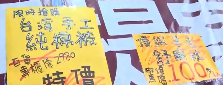 搶搶搶,搶成一團,上千元棉被,500元有找,將近1.6折;羊毛枕頭一個也只要100元,結果讓民眾一口氣帶走10顆。