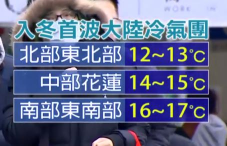 不過這一波東北季風,雖然減緩,但要留意,禮拜天(16日)下半天,就有入冬以來首波大陸冷氣團會南下,將有一波偏乾冷空氣報到,預估會影響到下禮拜二(18日),而到時候,北部、東北部可能下探12、13度,中部、花蓮14、15度,南部和東南部16、17度。