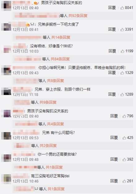 照片曝光後,不少網友認為這年齡出現此狀況相當罕見,紛紛歪樓留言,「這背部保養的很好,給妳一個讚」、「請尊重一下我不要背對著我說話」、「兄弟別擔心!只要堅持鍛煉,早晚會有胸肌的」、「兄弟有什麼問題嗎」、「沒救了兄弟」、「要堅強,現在沒有不代表以後也會有的」、「是不是P掉了」,不過也有網友認為,「可能發育晚!趕緊去看醫生」、「趕緊找個男朋友,或許能刺激一下」。