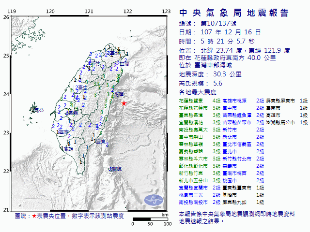中央氣象局發布顯著有感地震最新消息,今(16)日5時21分,發生芮氏規模5.6有感地震,震央位置在花蓮縣政府東南方 40 公里(位於台灣東部海域) ,震源深度30.3公里。