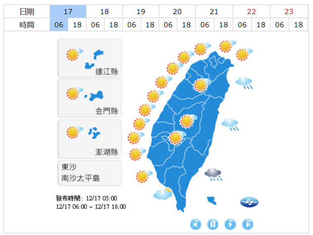 入冬第一波大陸冷氣團16日晚逐漸南下,北臺灣氣溫明顯下降,各地氣溫也轉涼,迎風面的北部及東半部地區有局部降雨出現,而今(17日)北台灣整天偏冷,低溫僅14至15度,午後將越來越冷,入夜氣溫甚至下探12度,其他各地低溫約16至18度,但晚起這些地方氣溫也將明顯下降,低溫將下探14至17度,不過各地仍可見陽光,屬乾冷型態。
