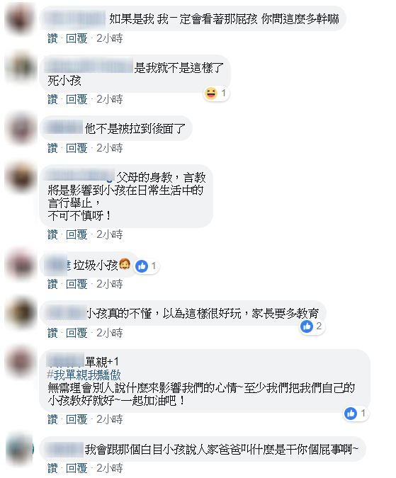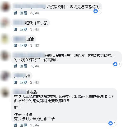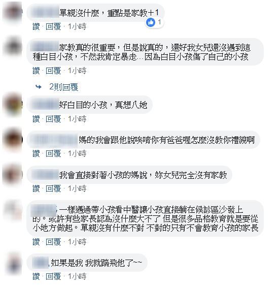 看完原Po的貼文後,網友紛紛憤怒表示:「我會跟她說:你有爸爸喔?怎麼沒教你禮貌啊?」、「好沒教養啊 !媽媽是怎麼教導的」、「沒有爸爸不可恥,沒家教才可悲」、「現在很多這種不負責任的家長」、「現在很多小孩真的很白目,家長都不管的」、「放任孩子就不對了…不導正後悔的是父母」、「不會教的家長到底幹嘛用的」。