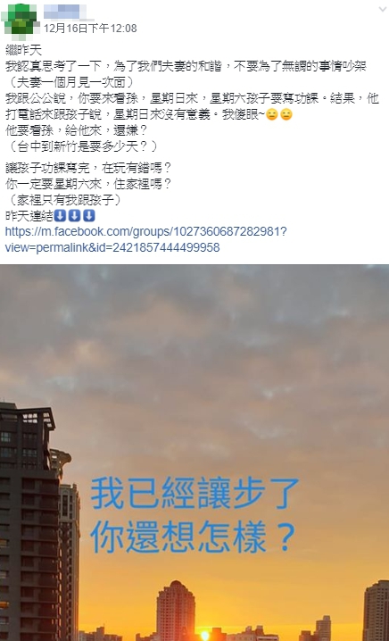 人妻在臉書社團《爆怨公社》發文,表示老公一個月才回家一次,但公公卻幾乎每個星期五晚上都會打電話來說「明天要來看孫」,但她星期六難得休假,會想好好放鬆休息,「公公一來,我還得要全副武裝,又不能不穿內衣、褲子在家走來走去,而且孩子功課都沒寫完,常常寫到星期六晚上才寫完,而且老公又不在,公公來幹嘛?」不料,公公被拒絕後,竟覺得媳婦是故意不給他看孫,還跑去跟兒子反應,人妻表示,老公覺得她不給爸爸看孫是一件很過分的事情,是故意找麻煩,「老公還說『我爸只是來看孩子,又沒幹嘛?』我們就吵架了。」