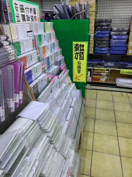 真的有那麼多人需要嗎?近年台灣的離婚率居高不下,夫妻時常因情感不睦、直到雙方的愛像電池耗盡了,就會選擇走上離婚一途。近日有網友走進文具店時發現,在琳瑯滿目的商品裡,突然發現亮點,清楚地標示5個大字,讓有此需求的消費者能一目了然,其他網友見狀後,紛紛笑虧:「比履歷表還好賣」。