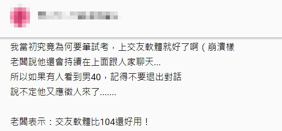 沒想到正當員工們嘲笑老闆「這會被當詐騙吧,你確定警察沒在樓下」、「你是不是假借面試名義把人家騙來,想幹嘛」之際,老闆的分機響了,竟然是交友軟體上的女孩來面試,結果女孩順利面試上了,不久便要到公司報到,老闆更沾沾自喜地表示,未來還會繼續在交友軟體上找人聊天、徵才,讓原PO忍不住笑說「如果有人看到男40,記得不要退出對話,說不定他又應徵人來了!」