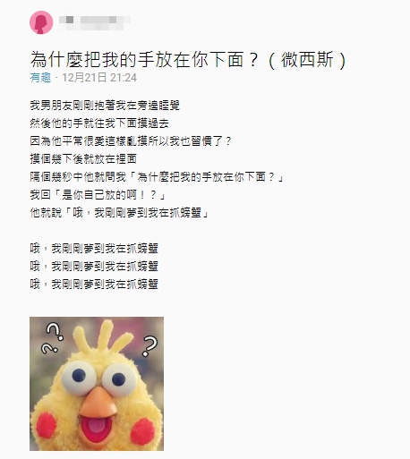 女網友21日在《Dcard》的有趣版以「為什麼把我的手放在你下面?」為題發文,提到男友抱著自己睡覺,「然後他的手就往我下面摸過去」,由於對方平常就會做這些舉動,所以自己也見怪不怪,「摸個幾下後就放在裡面」,但隔幾秒後,男友卻突然清醒,問她,「為什麼把我的手放在妳下面?」原PO錯愕的回應,「是你自己放的啊!?」這時男友似乎想起原因,悠悠地說,「哦,我剛剛夢到我在抓螃蟹」,跳TONE回應讓女網友超傻眼,頓時不知道該說什麼。