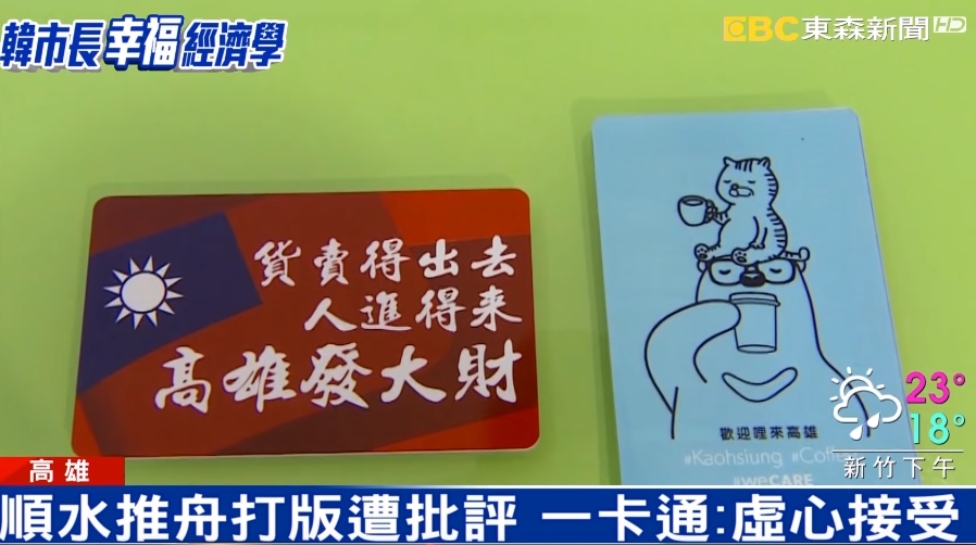 25號韓國瑜就要就職,一卡通公司推出兩款限量版一卡通,其中一款就是韓國瑜的口號「高雄發大財」,網友認為一卡通這回是不是太狗腿?但一卡通回應,是因為先前有業者自己打版做韓國瑜版一卡通,讓民眾誤以為是一卡通發售的,這回只是想迎合參加就職典禮的民眾所期待,而另一款一卡通則是傳達陳其邁愛高雄的意向,卻沒想到引發爭議。