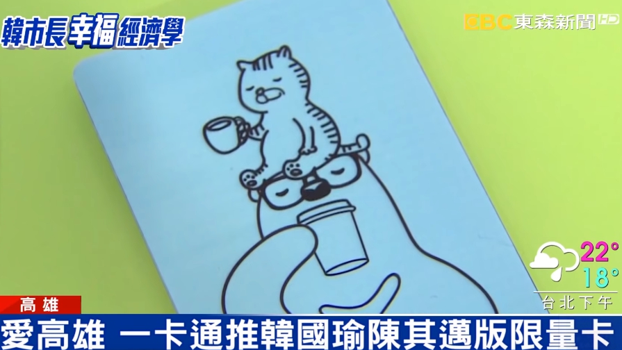 不只有韓國瑜版,像是這張咖啡小貓,歡迎來高雄,傳達的就是陳其邁意向,同樣限量888張連續兩天在輕軌站販售,想傳達的就是兩位候選人對高雄的正面意向,一卡通解釋,原本從設計到打版要一個月,這次兩款一卡通也是三天前才決定要做,甚至分兩家工廠合力趕工,力拼24號上午搭高鐵成功送達高雄。