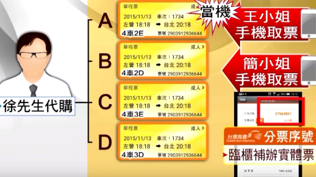 人都還沒進站,票卻已經使用過,這是那招?白白浪費一張高鐵票,簡小姐當然得查個清楚,高鐵站沒給答案,簡小姐,自己追。車票是找網路一位徐先生買的,徐先生一次買了4張,11/13左營往台北的票,分給4個人,簡小姐取第二張票,4車2D的位置,另一位王小姐分到4車2E的票,但她的手機當機,資料不見,拿著當初分票續號到高鐵站補申請實體票,站務員隨機找了一張,就剛好挑中簡小姐的票補給王小姐。