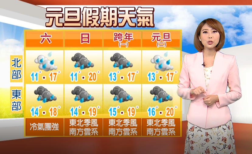 桃園以北及東半部有短暫雨,至於中南部則為多雲到晴的天氣,白天高溫可以回升到22度至24度,日夜溫差較大。由於氣溫變化幅度大,也請大家做好保暖,並留意身邊心血管疾病患者、幼兒及年長者的健康狀況。