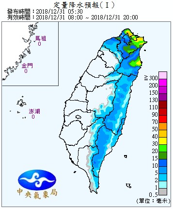今(31)日是2018年最後一天,受東北季風及南方雲系北移影響,各地天氣仍涼,迎風面北部、東北部降雨仍持續,依舊有局部大雨的可能,被稱是「10年最差跨年天氣」。