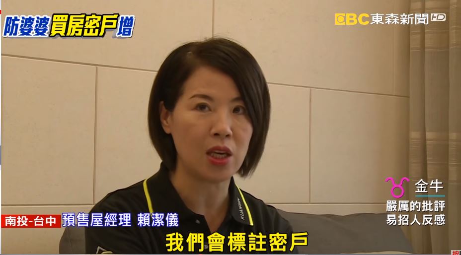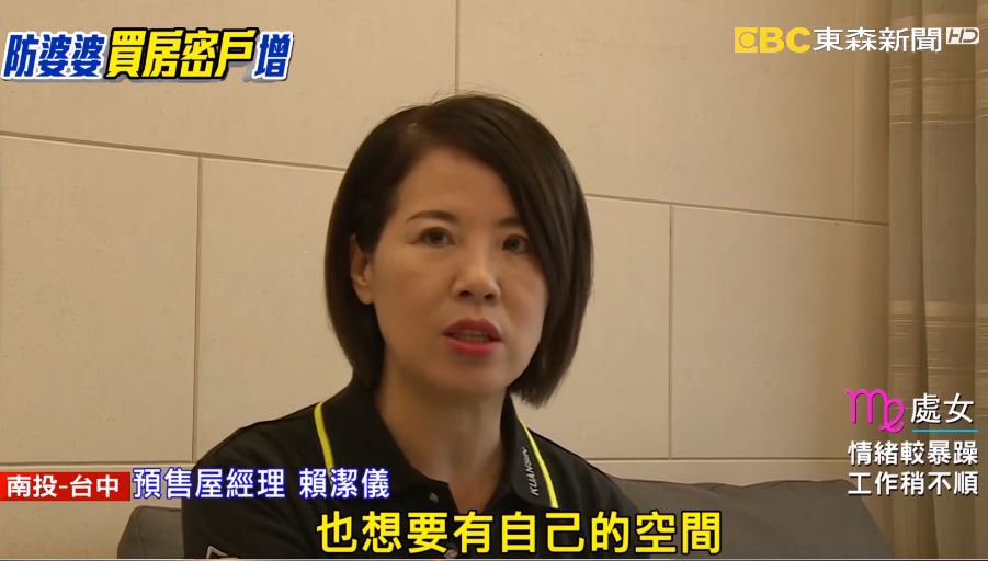 預售屋經理賴潔儀:「(女性密戶)占的比例滿高的,有些跟公婆相處上,有很大的瓶頸跟困擾,也想要有自己的空間,這個佔的比例也滿高的」。