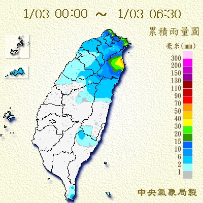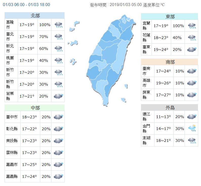 今天(3日)東北季風持續影響,且仍有一些南方雲系北移到台灣上空,雖然水氣有逐漸減少的趨勢,但在迎風面的北部及東半部地區整天天氣仍陰雨,其中基隆北海岸、東北部地區及大台北山區有局部大雨發生的機率。