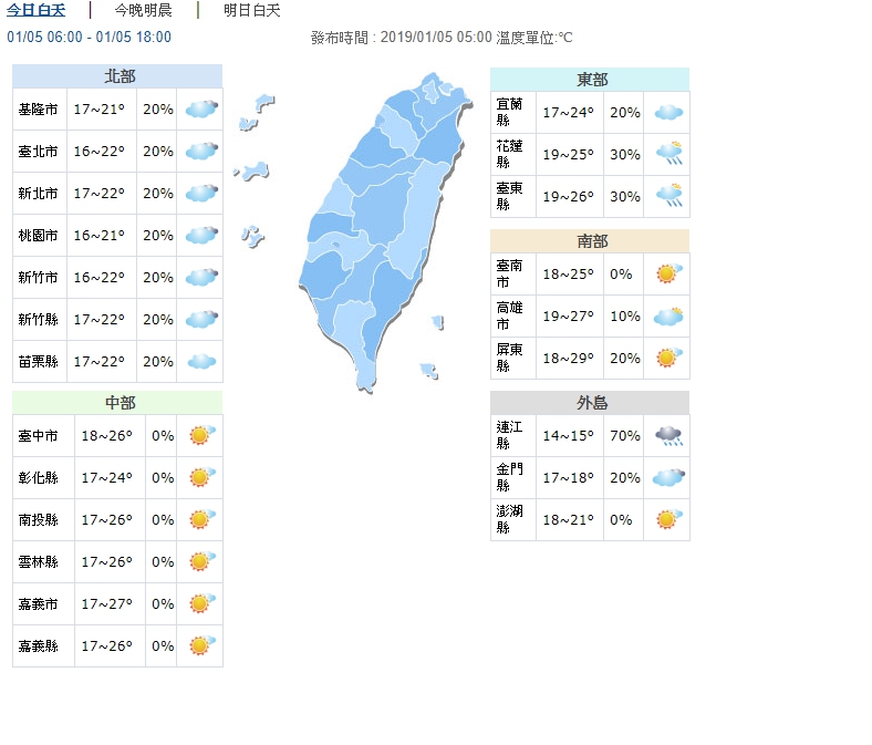 今(5)日是24節氣的小寒,中央氣象局表示,白天有微弱鋒面通過,東半部及北部山區降雨機率增加,有局部短暫雨,北部平地雲量也會增多,中南部仍維持多雲到晴的天氣。