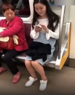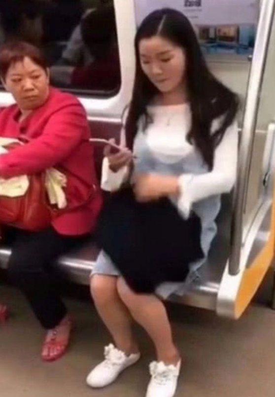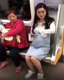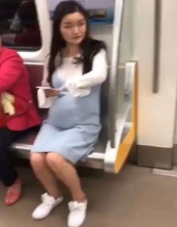 綜合陸媒報導,一名年約20幾歲,留著黑色長髮、身穿淺藍色連衣裙的孕婦搭乘地鐵,從外表看來孕期已有5、6個月,因此一上車就有人讓座,她坐下後一邊滑手機,還不時撩起頭髮露出耳朵,沒想到下一秒,她卻開始將手伸進連衣裙的領子內,像是在掏東西,只見她左顧右看露出詭異笑容,接著竟默默抽出一件黑色外套,凸肚瞬間「夷為平地」,原來她根本沒有懷孕,是為了獲得座位才懷孕,女子事後則裝沒事繼續玩手機。