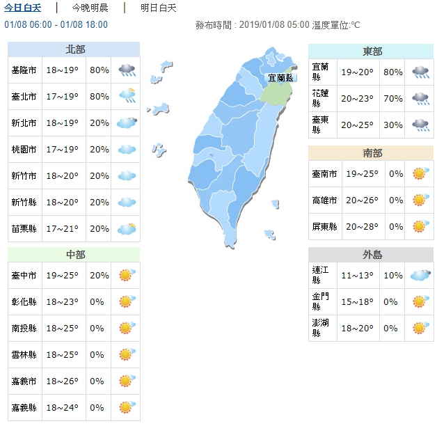 溫度方面,北台灣白天僅19、20度,花東約21至24度,中南部高溫還是有25至28度,今晚至明(9)日清晨,中部以北及東北部低溫約16度上下,其他各地約17至19度。