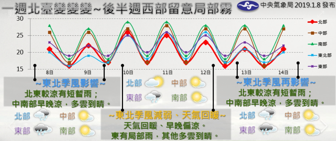 今(9)日受東北季風影響,北部及東北部天氣較涼,東北部地區有短暫雨,北部、東部及東南部地區有局部短暫雨,其他地區及澎湖、金門、馬祖為多雲到晴的天氣。明(10)日東北季風稍減弱,氣溫回升,台灣各地及澎湖、金門、馬祖大多為多雲到晴,僅東半部地區有局部短暫雨。