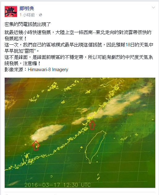 還說道最近幾小時在大陸上空密集發展,因此18日可能現「雷雨」,表示這不是鋒面,是鋒面前暖區的不穩定帶,所以可能有劇烈的中尺度天氣系統發展。