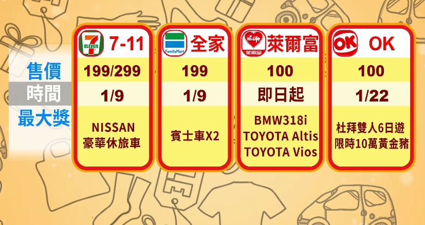 比較這次福袋大獎,統一和全家頭獎都送汽車,另外也有3C和家電類產品,萊爾富也已經開始販售限量55萬份,前三獎都是汽車,而今年加入戰局的OK超商,同樣打出百元,22號限量開賣1萬個,頭獎則推杜拜雙人6日遊,加碼價值10萬元的黃金豬。