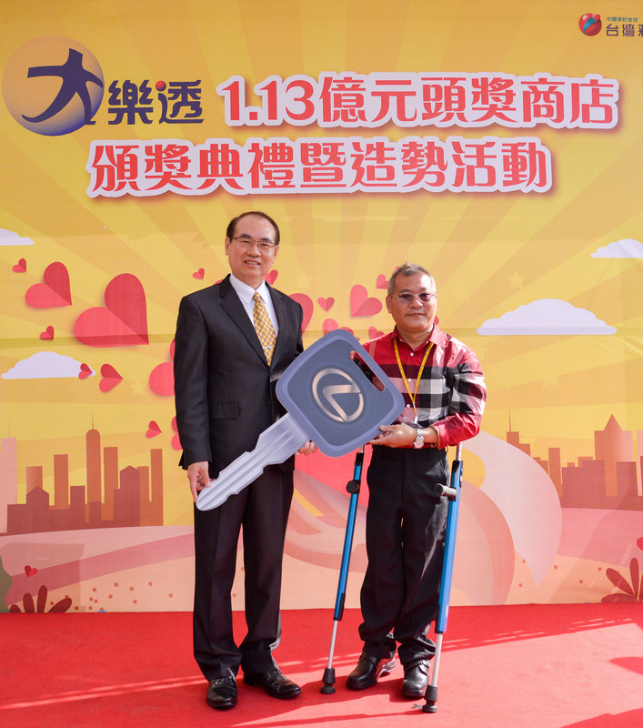 台灣彩券總經理蔡國基今天受中獎人之託,在南投縣草屯鎮開出頭彩的彩券行致贈投注站店員魏順正一輛總價約260萬元的豪華休旅車,及投注站紅包6.6萬元。