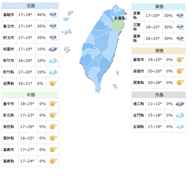 氣象局指出,早晚各地稍涼,清晨觀測低溫中部以北及東北部約攝氏16至18度,南部及花東約19、20度,白天北台灣高溫仍僅20度左右,整天較涼,花東約22至24度,中南部仍可達27、28度,日夜溫差大,請民眾留意溫度變化適時調整穿著。