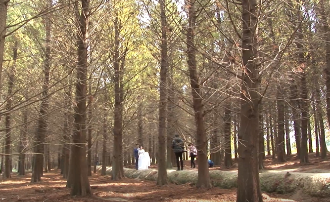 部分枯枝帶著淒涼美感,更讓這片樹林增添神祕和浪漫,八德落羽松美景如畫,不只吸引遊客,就連新人 也不錯過這難得的景象,為人生的重要時刻留下紀念。