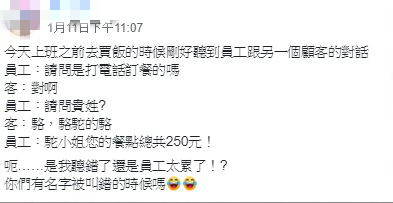 原PO在爆怨公社透露,她在上班前去買飯的時候剛好聽到員工跟另一個顧客的對話,員工問道:「請問是打電話訂餐的嗎?請問貴姓?」客人回:「駱,駱駝的駱。」員工卻說:「『駝』小姐您的餐點總共250元!」