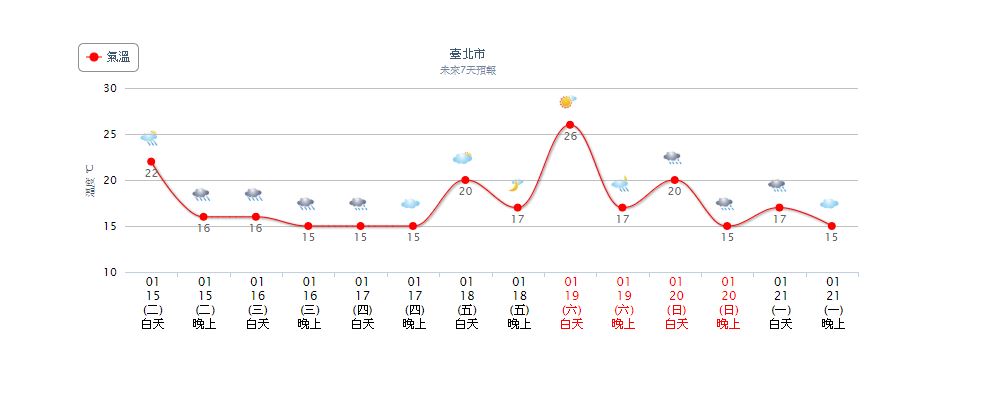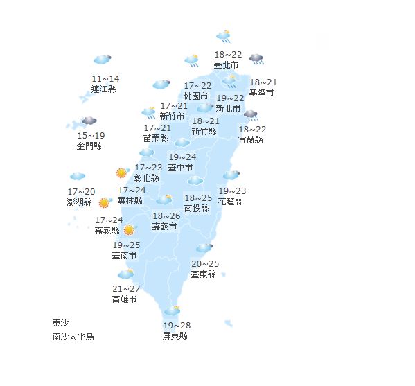 氣象局指出,15日清晨各地低溫18至20度左右,稍有涼意,北部及東北部高溫約21至23度,花東高溫23至25度間,中南部局部地區仍可達27度以上,週三、四將轉陰雨天氣,越北部越濕冷,民眾須添加保暖衣物。