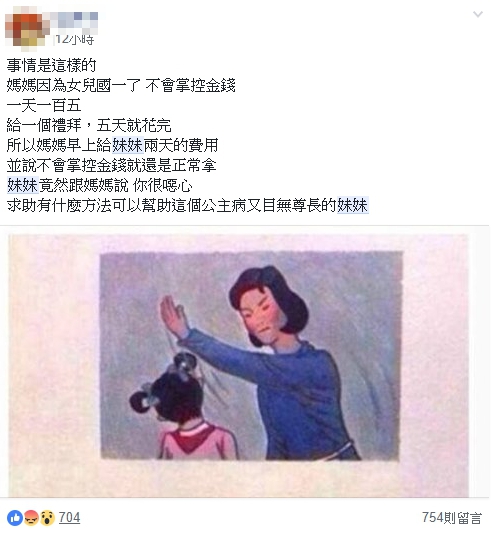 女網友在臉書社團《爆怨公社》發文,表示就讀國一的妹妹1天零用錢150元,這金額包含早餐和晚餐,且六、日都給,起初媽媽會一次給一個禮拜的份共1050元,但妹妹卻5天就花完,「所以媽媽早上給妹妹2天的費用,並說不會掌控金錢就還是正常拿,妹妹竟然跟媽媽說『妳很噁心』」,原PO又氣又無奈地問,「求助有什麼方法可以幫助這個公主病又目無尊長的妹妹?」