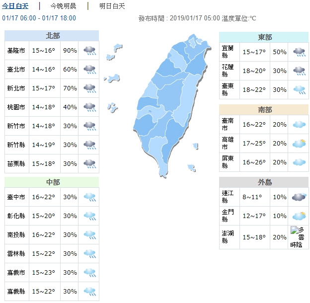 中央氣象局表示,今(17)日仍是東北季風及華南雲雨區影響,但是水氣較昨天減少,雨勢方面也會有所緩和,中南部地區會從局部短暫雨轉為多雲的天氣,基隆北海岸、大臺北山區及宜蘭地區還是有短暫的雨勢出現。